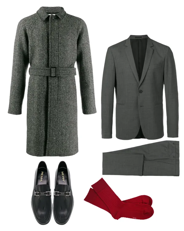 Никогда и ни за что не перестанем любить этот тандем: серое длинное пальто с узором «в ёлочку» и темно-серый классический костюм. В качестве обуви однозначно выбираем кожаные лоферы и добавим немного яркого цвета — стильные мужские носки Tezido в благородном винном оттенке.