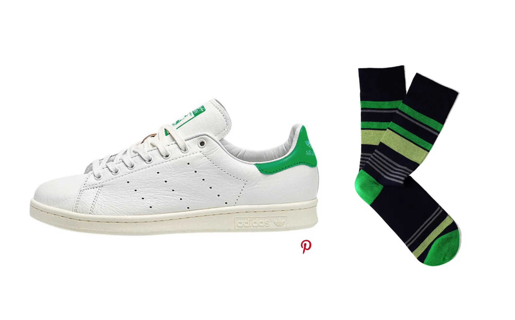 К этой паре мы бы рекомендовали выбрать мужские носки зеленого цвета. Но не просто зеленого, а в разноцветную полоску в этих же оттенках. Чтобы не утяжелять образ, остальную часть одежды выбирайте в минималистичных тонах.