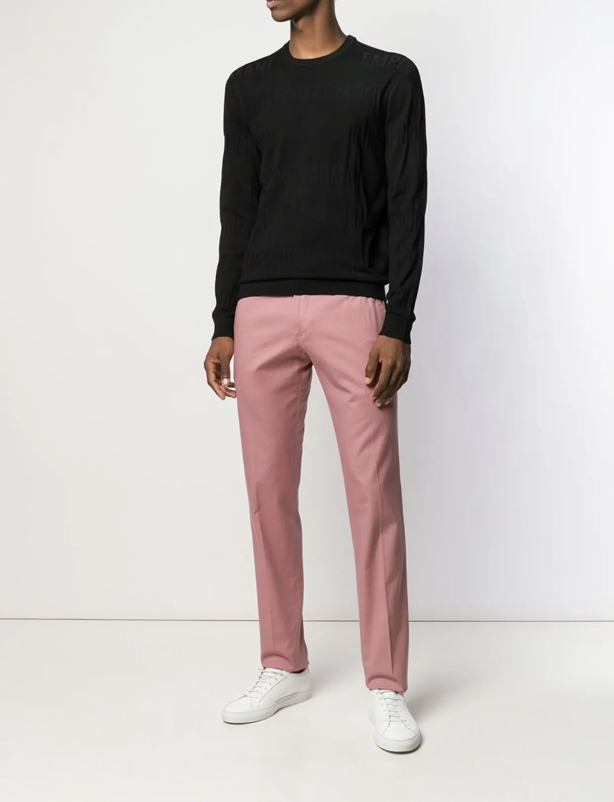Трендовые в этом сезоне брюки-чиносы, джинсы, легкие спортивные, а также всеми любимые классические модели прекрасно смотрятся в розовых оттенках. Сочетайте их с белой футболкой и серым джемпером.